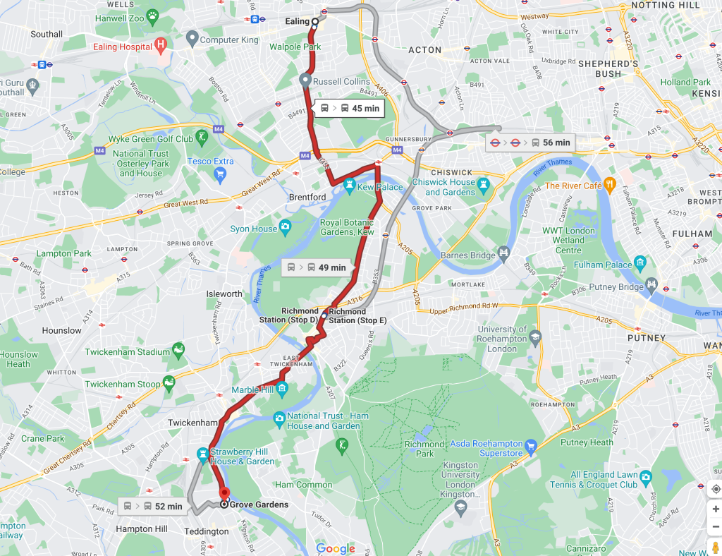 From Ealing Broadway and South Ealing, take the 65 bus south. This takes you to Richmond Station (Stop D). Cross the road at Richmond and take the R68 bus (Stop E) towards Hampton Court.