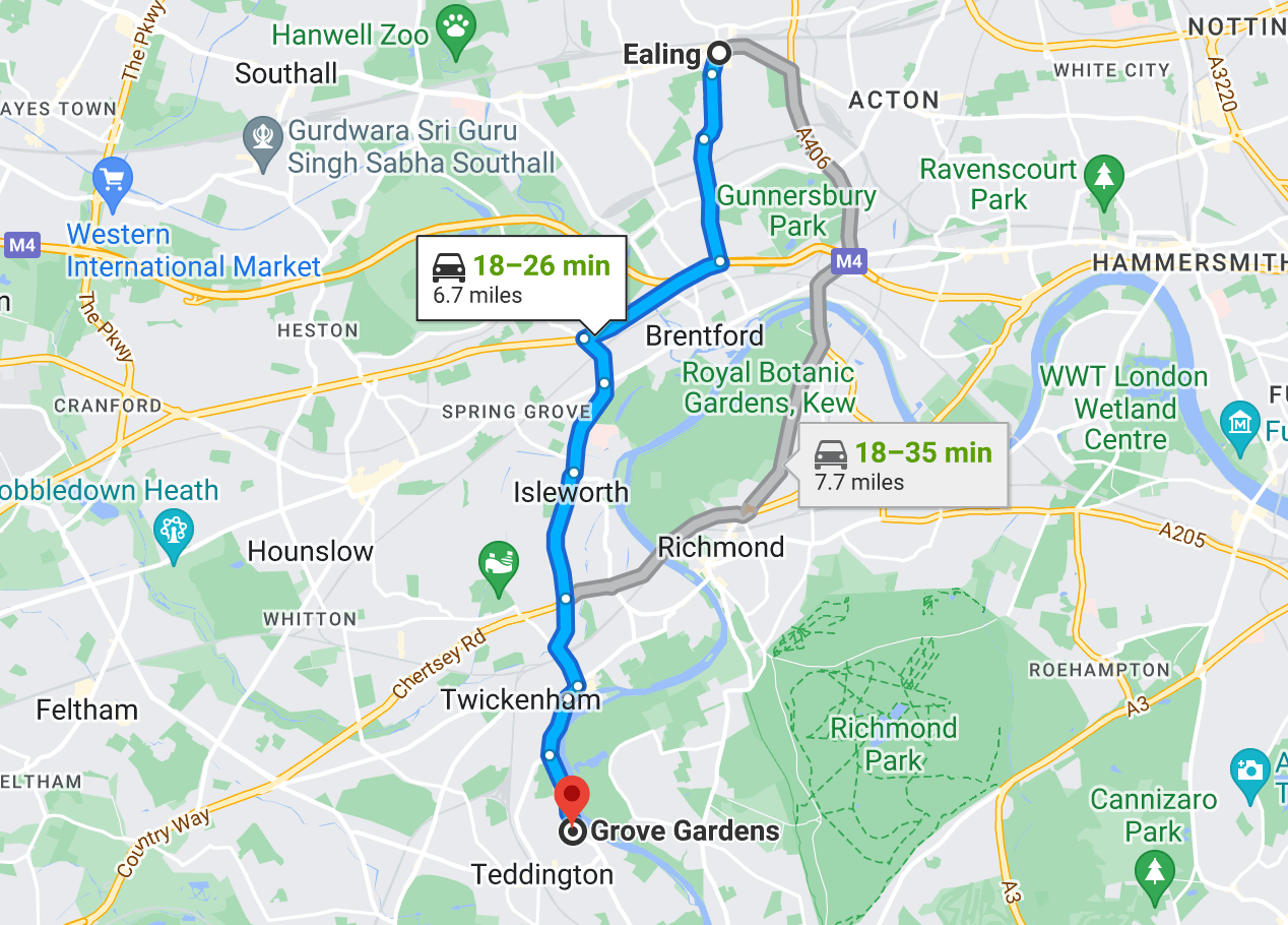 Guitar lessons with Stuart now take place at his home in Grove Gardens, Teddington. It’s a short drive from Ealing. Head south to the A4, head west along the A4 until you can turn south down Spur Road and then Twickenham Road. Cross the A316 and go through Twickenham High Street. Finally turn left down the A310 which will take you all the way to Grove Gardens.
