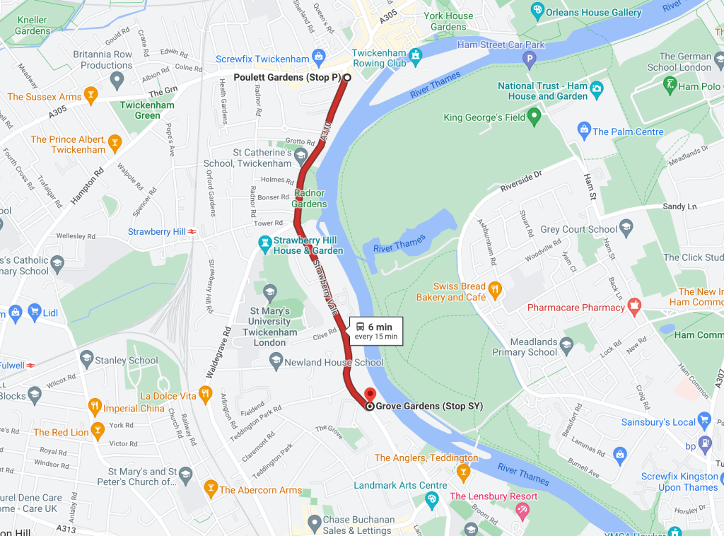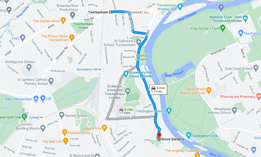 It’s just a short drive or bus journey from Twickenham to your guitar lessons with Stuart, at Grove Gardens, Teddington. Below are straight-forward directions and frequent bus and train routes.